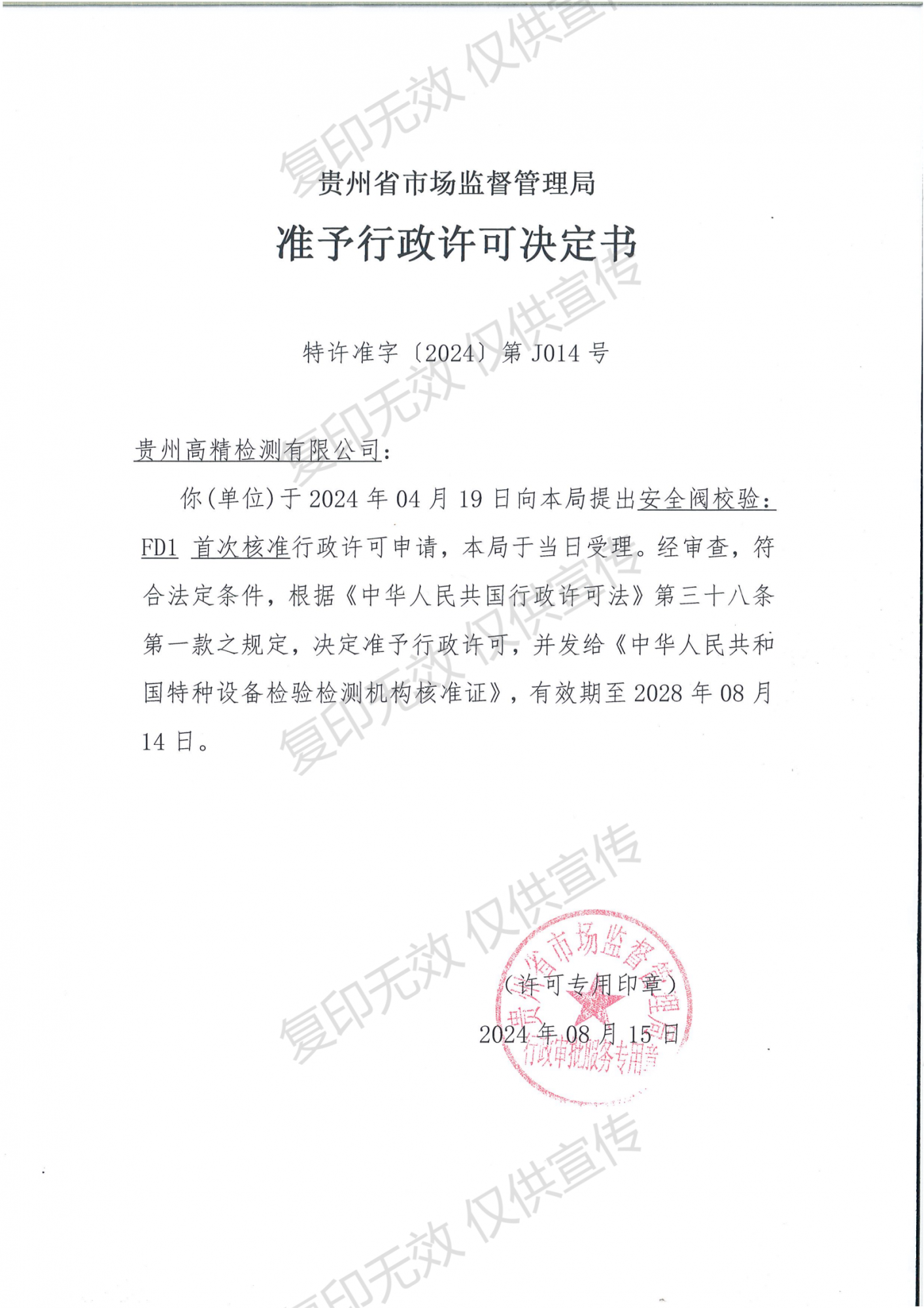 2024年以来,贵州高精检测有限公司加大技术、设备、资金投入,具备了安全阀校验资质申办条件,并于2024年4月向贵州省市场监督管理局提请申办。6月公司通过中国特种设备检验协会专家组评审。8月,公司获得贵州省市场监督管理局颁发的特种设备检验检测机构核准证书和服务市场许可,现在我公司可以为企业提供安全阀在线和离线校验服务。